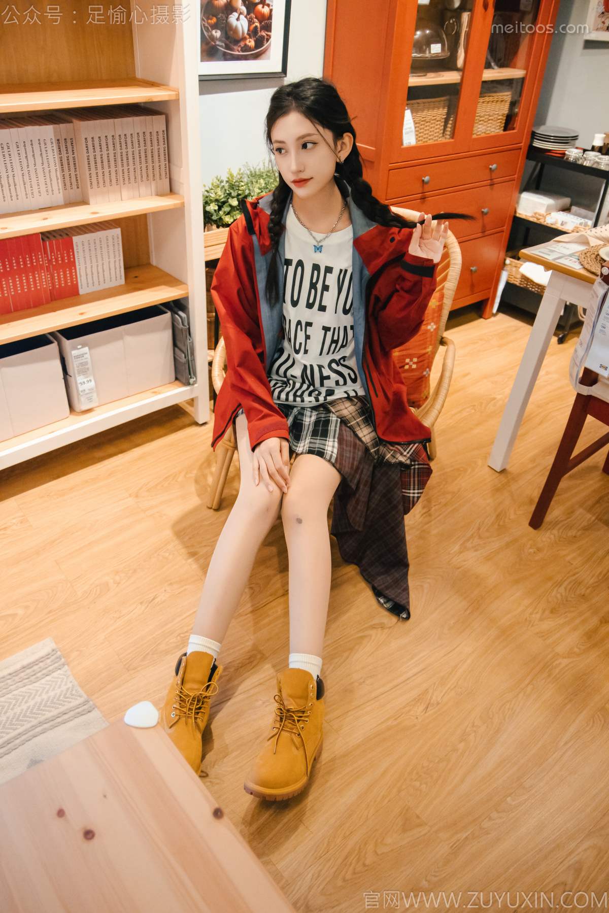 优萌馆 | 魅人堂 » 足愉心 NO.015 可乐(搭配:红色夹克、白T、短裙、马丁靴、肉丝色袜、白棉袜)