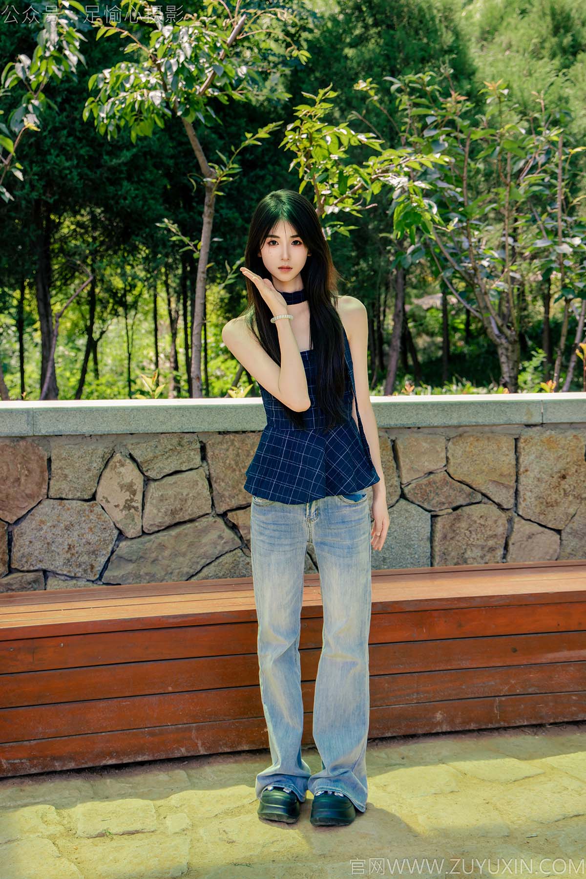 足愉心 NO.049 小瑶(搭配:蓝色格子吊带、牛仔长裤、白棉袜、洞洞鞋、裸足)